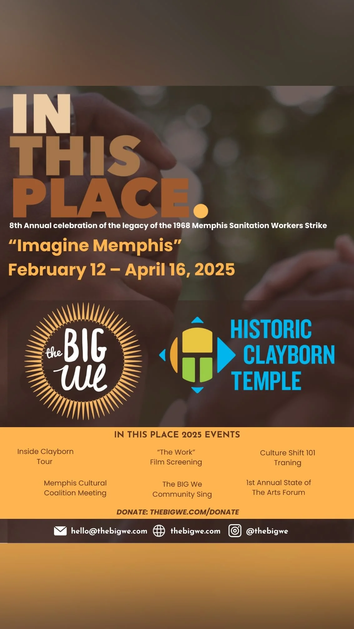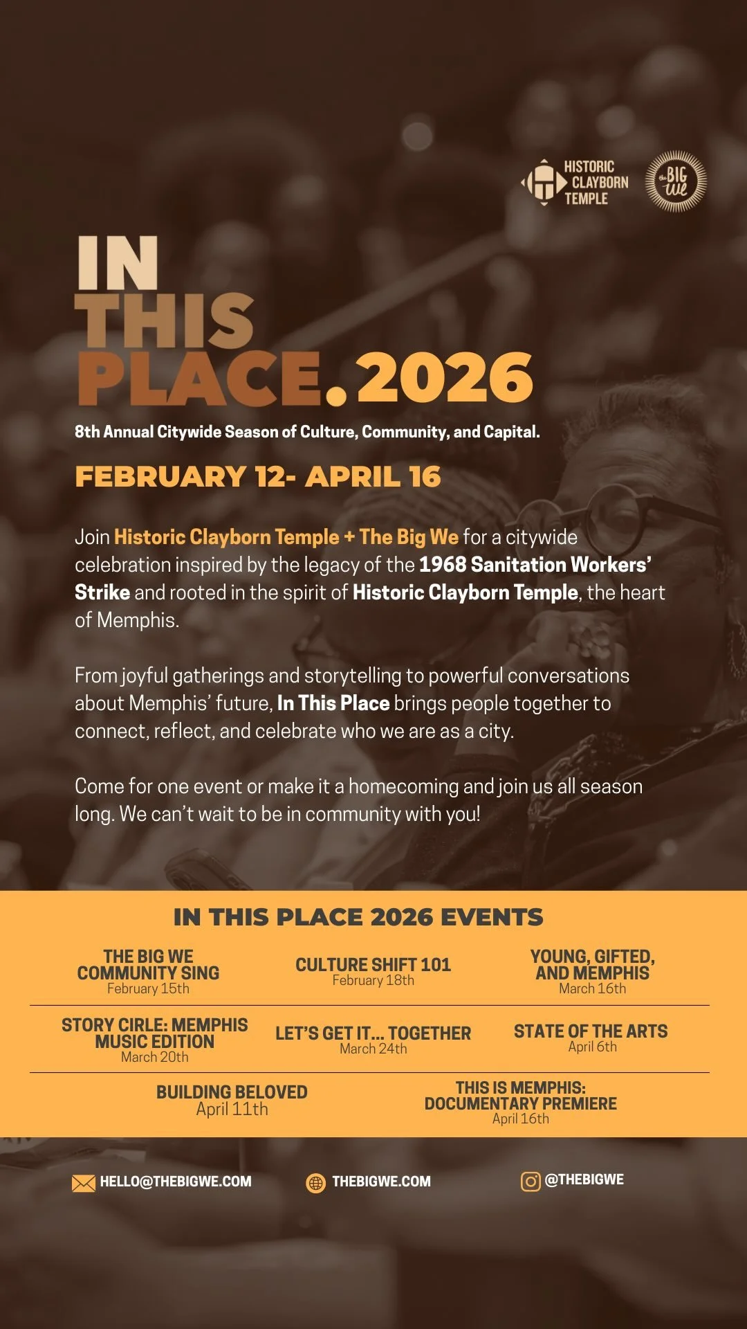 Join Historic Clayborn Temple + The Big We for a citywide celebration inspired by the legacy of the 1968 Sanitation Workers' Strike and rooted in the spirit of Historic Clayborn Temple, the heart of Memphis.